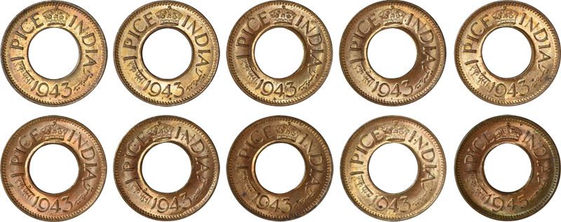 Lot of 10 Coins : King George VI, Bronze 1 Pice, 1943,(9 coins), Pretoria Mint, High Crown, (PR # 705), 1945, (1 coin) Calcutta Mint, Flat Crown, (PR # 696), UNC.