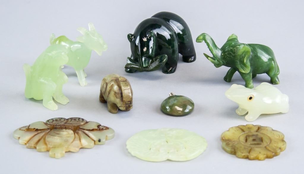Lot of 10 Chinese hardstone and jade carved figurines, of various shapes and colors. 7 x 8 cm. 561 grams (total).