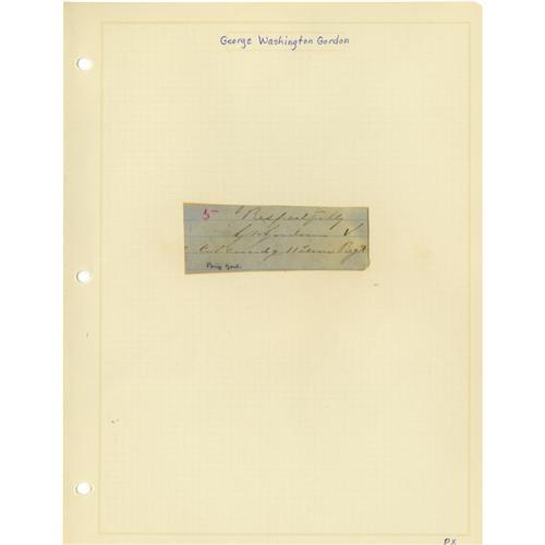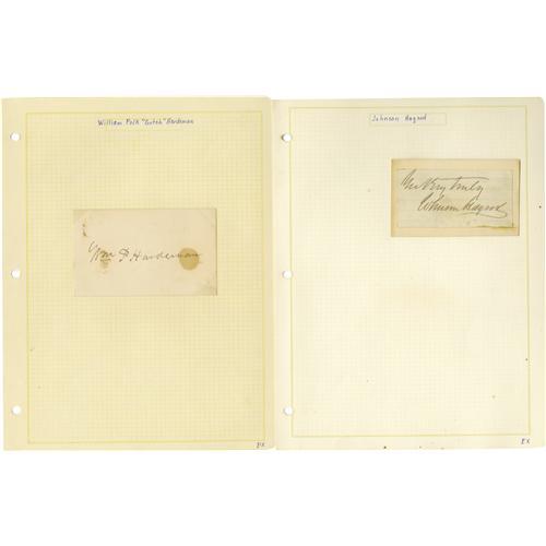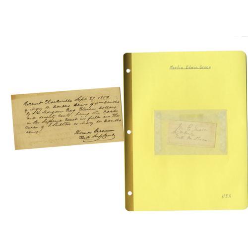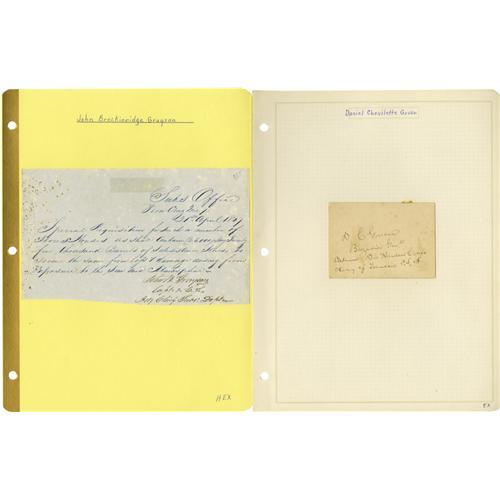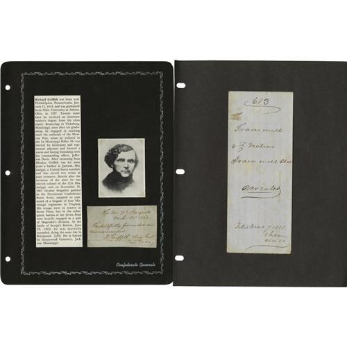 <B>Group Lot of Ten Confederate Generals' Autographs</B></I> consisting of: <BR><B>George Washington Gordon</B></I>- Clipped signature with <I>"commanding, 11 Tenn. Rgt"</B></I> below, on blue lined paper, very good. <BR><B>Daniel Chevilette Govan</B></I>- Signature card with rank below, age toned, very good. <BR><B>John Breckinridge Grayson</B></I>- Nice 1847 ANS as Captain. <BR><B>Martin Edwin Green</B></I>- Clipped signature with his rank below, very good. <BR><B>Thomas Green</B></I>- Signed receipt dated 1850, age toned but bold text. <BR><B>Thomas Green</B></I>- Signed endorsement, dated 1855, age toned but fine. <BR><B>Richard Griffith</B></I>- Signature card with rank below, dated 1862. Killed at the battle of Savage's Station, 1862. <BR><B>Johnson Hagood</B></I>- Large, bold clipped signature. <BR><B>William Polk Hardeman</B></I>- Signature card with bold signature, glue stains bleeding to front. <BR><B>Nathaniel Harrison Harris</B></I>- TLS, dated 1895, bold signature, nice.<BR><BR><b>Shipping:</b> Small Flat (<a target="_blank" href="http://www.heritageauctions.com/common/shipping.php">view shipping information</a>)