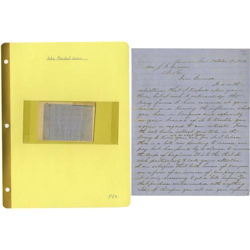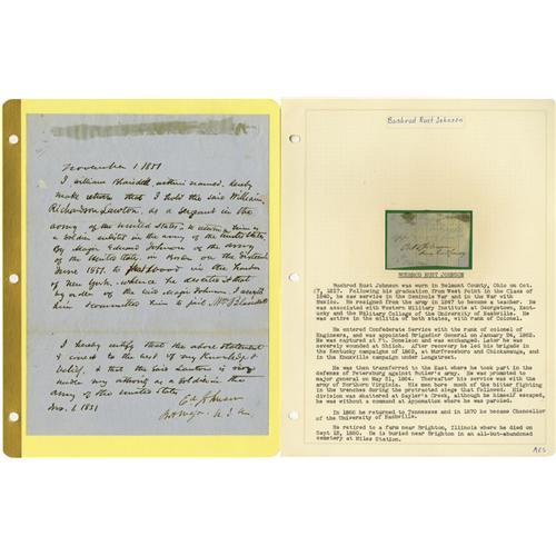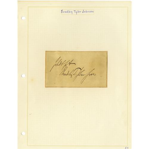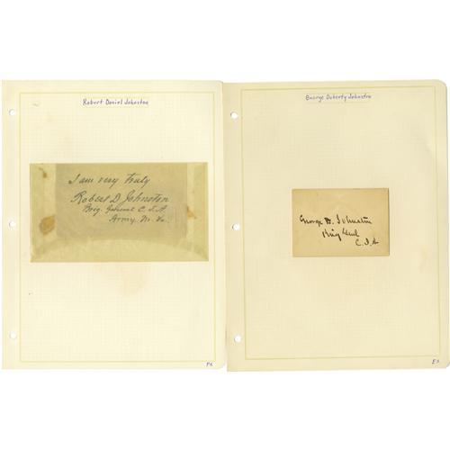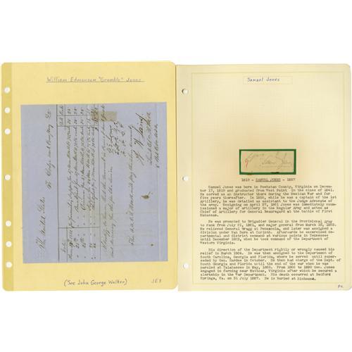 <B>Group Lot of Ten Confederate Generals' Autographs</B></I> consisting of: <BR><B>Bradley Tyler Johnson</B></I>- Large, bold clipped signature. <BR><B>Bushrod Rust Johnson</B></I>- Clipped signature, wartime date, on blue lined paper, slightly faded. <BR><B>Edward Johnson</B></I>- Signed endorsement, one page of blue paper, 7.5" x 10", November, 1851, remnants of glue on back, else fine. <BR><B>George Doherty Johnston</B></I>- Signature card with Brig. General rank below and <I>"C.S.A.",</B></I> clear signature. <BR><B>Robert Daniel Johnston</B></I>- Clipped signature with letter closing, rank below, Army of Northern Virginia, bold, clear signature. <BR><B>David Rumph Jones</B></I>- ALS, three pages on lined blue paper, 8" x 10", Benicia, California, October 19, 1856, to California Congressman James W. Denver regarding a bill before Congress to raise army pay, with original free-frank envelope, in fine condition. Jones is alleged to have hauled down the national colors at Ft. Sumter. <BR><B>John Marshall Jones</B></I>- Clipped signature, wartime date, moderately faded, else good. <BR><B>Samuel Jones</B></I>- Clipped signature card, faded else good. <BR><B>William Edmonson Jones</B></I>- Signed ration return, one page on blue paper, 7" x 7", June, 1857, clear and very good. <BR><B>Thomas Jordan</B></I>- Clipped signature with Adj. General rank below, on age toned paper, else very good.<BR><BR><b>Shipping:</b> Small Flat (<a target="_blank" href="http://www.heritageauctions.com/common/shipping.php">view shipping information</a>)