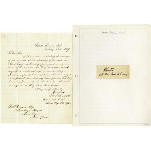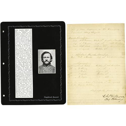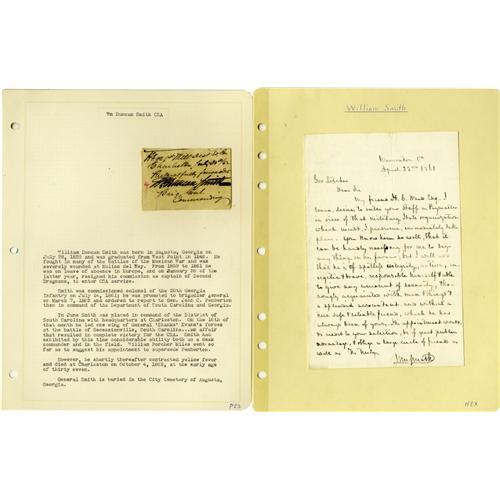 <B>Group Lot of Ten Confederate Generals' Autographs</B></I> consisting of: <BR><B>James Argyle Smith</B></I>- Signature card with rank below. <BR><B>Martin Luther Smith</B></I>- ALS, one page, 7.75" x 10", dated July 14, 1857, fine. <BR><B>William Smith</B></I>- ALS, one page, 5.25" x 8", Warrenton, Virginia, August 22, 1861, to Virginia Governor John Letcher, recommendation letter, fine. <BR><B>William Duncan Smith</B></I>- Bold clipped signature dated 1862. <BR><B>Leroy Augustus Stafford</B></I>- roster for Hays Brigade, one page lined paper, 7.5" x 10.75", August 19, 1863. Stafford was mortally wounded May 5, 1864 at the Battle of the Wilderness. <BR><B>George Hume Steuart</B></I>- ALS, three pages, 7.75" x 10", New York, New York, July 29, 1843, fine. <BR><B>Walter Husted Stevens</B></I>- Endorsement, 7.75" x 9.25", September 2, 1862. <BR><B>Carter Littlepage Stevenson</B></I>- Clipped signature with rank below. <BR><B>Andrew Peter Stewart</B></I>- Signature card dated July 10, 1907. <BR><B>Marcellus Augustus Stovall</B></I>- Signature card, fine. "<I>M.A. Stovall, Brigadier General Cmdg., Stovall's Brigade, Breckinridge Division, Hill Corps, Army Tenn.</B></I>".<BR><BR><b>Shipping:</b> Small Flat (<a target="_blank" href="http://www.heritageauctions.com/common/shipping.php">view shipping information</a>)