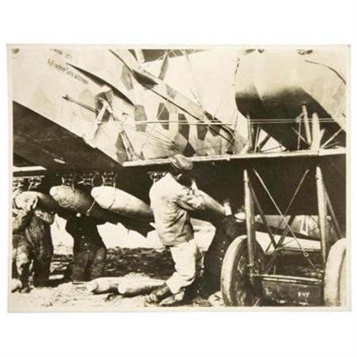 <B>Lot of Ten Early Aviation Photographs,</B></I> variously 4” x 5” to 8” x 10", 1910s - 1930s. Heavily focused on World War I aircraft, these images mostly depict German and British planes. Included here is a remarkable photo of a German ground crew arming a Gotha bomber. The sole peacetime shot is of an English race trophy winner. Very good to fine condition, many images have explanatory imprints on verso.<BR><BR><b>Shipping:</b> Flat Material, Small (<a target="_blank" href="http://www.heritageauctions.com/common/shipping.php">view shipping information</a>)