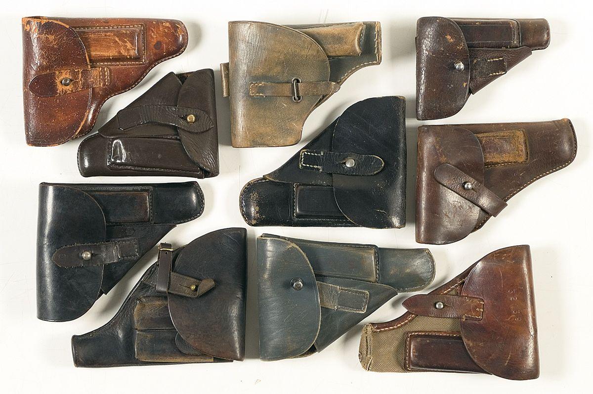 Lot of 10 military holsters includes: 1) Brown holster with green canvas body, "32139" stamped on outside flap with "Pistole 37M (Ung.) Kal. 7.65mm" stamped on inside flap; 2) Unmarked teal colored holster with magazine; 3) Unmarked light brown/teal colored holster for WWII Italian Beretta; 4) Black holster with "WaA" stamped on top of strap and "sat/44" stamped under strap; 5) Brown holster with two magazine compartments and "A.E" stamped on back. "Victory" marked gold medallion attached to belt of strap; 6) Black holster "Geco" marked WWII German holster; 7) Brown holster with "Dr. Rudi Oberndorte/Arzt" stamped on inside flap with "740961" stamped on back. Walther magazine in compartment; 8) Unmarked light brown holster; 9) Unmarked dark brown holster; 10) Brown holster with "Akah and emblem" stamped under strap. All holsters are in very good to excellent condition.