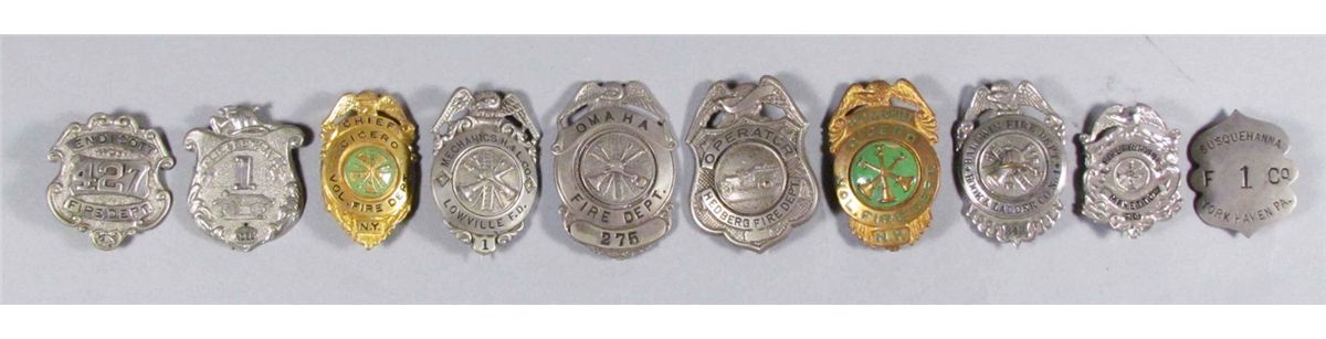 Lot of 10 Fireman's Shields, including Endicott, Elizabeth, NJ, Cicero, NY, Omaha, NE, Mechanics H & L, Hedberg Fire Dept., Baldwin, Minetto and Susquehanna. All in very good original condition.