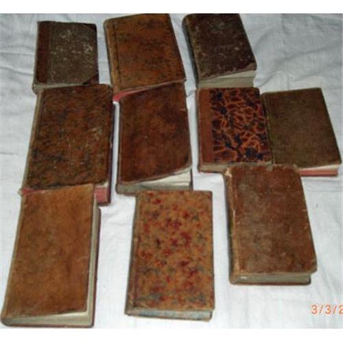 This is a large lot of very old French books,ten in all ranging in age from 1728 to 1781.COndition is good,some fraying on edges,spines and covers are in tact.One book has a piece cut from the first page,does not affect text.All of these books came from the estate of a French lady who came to the US as a WWII war bride and settled in Mt.Carmel,Il.as a doctors wife.She inherited them from her grandmother and mother from the Normandy/Lorie, France area.Amazing Antique Items!<p> Shipping cost calculated by zip code and weight.Thanks for looking.