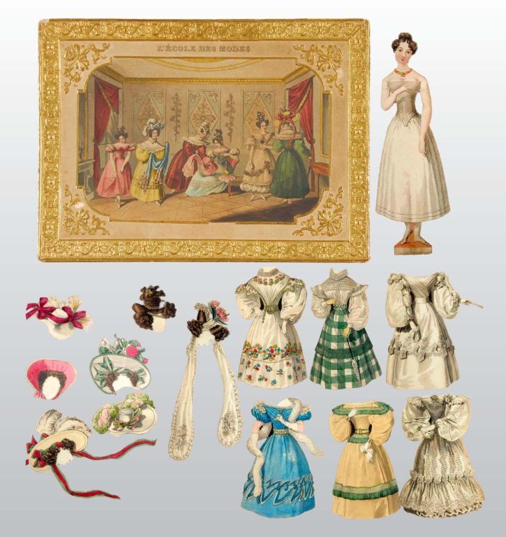 Description Circa 1830s-1840s. The Lovely French "L'Ecole Des Modes" boxed set contains a reinforced front/back 5.7-inch. She has six flawless gowns, seven headdresses/hats, and a wooden stand. The accompanying box is embossed with gold trim and a beautiful centerpiece featuring elaborately gowned ladies of the period. Fashions are similar to those printed in "The Beau monde". An incredible set!