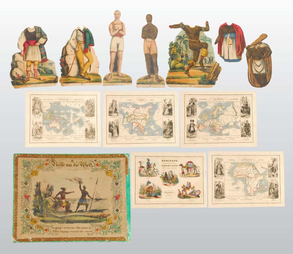 Description Circa 1850s. This fascinating set includes one 8-inch reversible white/black male doll with nine costumes that range from the primitive to the ethnic outfits of various countries. Six 9.75"x7" sheets have intricate drawings of the inhabitants of these countries and maps of the continents. The lithograph on the cover of the box pictures an African family signaling to a ship sailing toward land. The doll has neck and ankle bends and the box shows wear. An interesting, educational glance at the world of the mid-1800s.