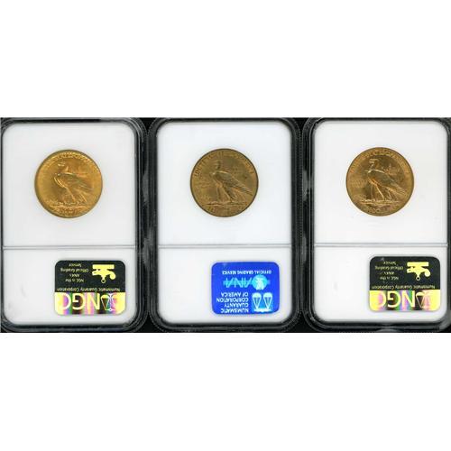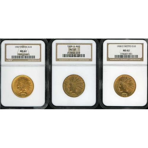 Includes: 1907 No Motto NGC MS62, 1908-D Motto NGC MS62, 1909-D NGC MS61. Lot of 3 coins.