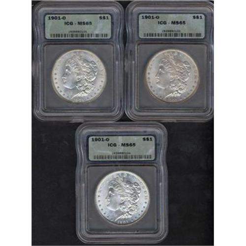 <b>Lot of Three 1901-O Morgan Dollars.</b> All are ICG graded MS65. Lot of 3 coins.