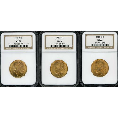 Includes: 1932 NGC MS64, 1932 NGC MS64, 1932 NGC MS64. Lot of 3 coins.