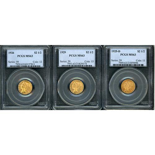 Includes: 1925 D PCGS MS63, 1926 PCGS MS63, 1929 PCGS MS63. Lot of 3 coins.