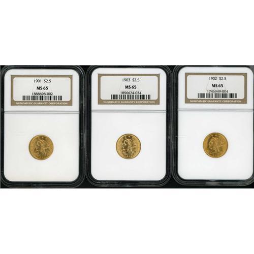 Includes: 1901 NGC MS65, 1902 NGC MS65, 1903 NGC MS65. Lot of 3 coins.