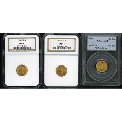 Includes: 1905 PCGS MS64, 1906 NGC MS64, 1907 NGC MS64. Lot of 3 coins.