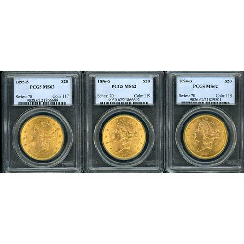 Includes: 1894 S PCGS MS62, 1895 S PCGS MS62, 1896 S PCGS MS62. Lot of 3 coins.