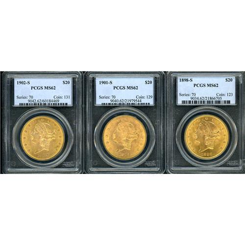 Includes: 1898-S PCGS MS62, 1901-S PCGS MS62, 1902-S PCGS MS62. Lot of 3 coins.