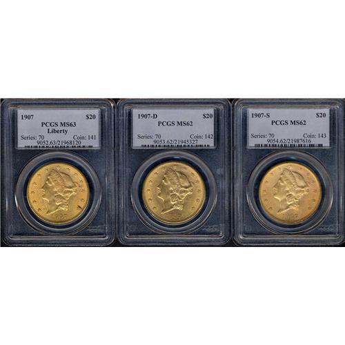Lot includes: 1907 PCGS MS63, 1907-D PCGS MS62, 1907-S PCGS MS62. Lot of 3 coins.
