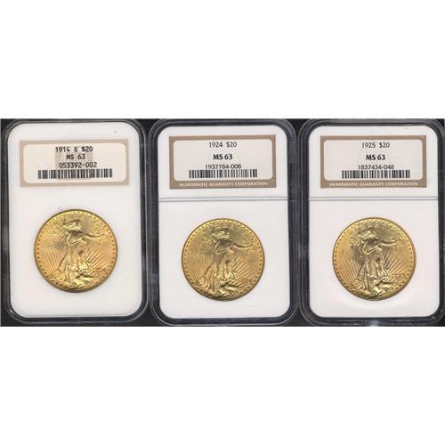 Lot includes: 1-1914-S NGC MS63, 1-1924 NGC MS63, 1-1925 NGC MS63. Above-average group of MS63 Saints. Lot of 3 coins.