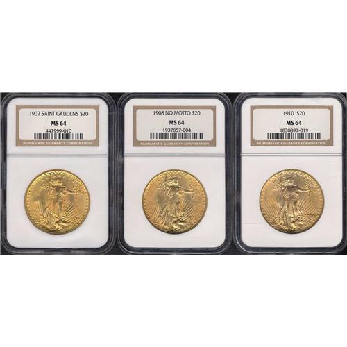 Lot includes: 1-1907 NGC MS64, 1-1908 NGC MS64, 1-1910 NGC MS64. Lot of 3 coins.