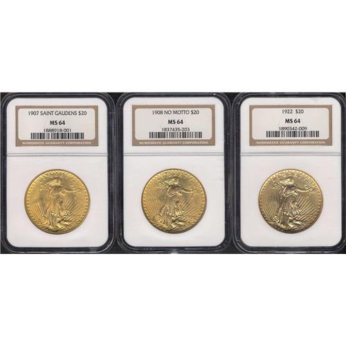 Lot includes: 1-1907 NGC MS64, 1-1908 NGC MS64, 1-1922 NGC MS64. Lot of three coins.