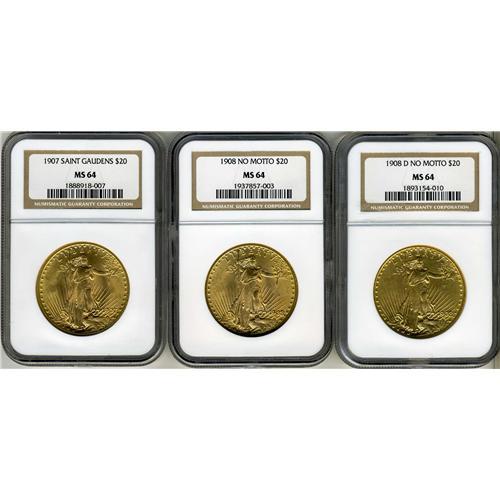 Lot includes: 1907 NGC MS64, 1908-D No Motto NGC MS64, 1908 No Motto NGC MS64. Lot of 3 coins.
