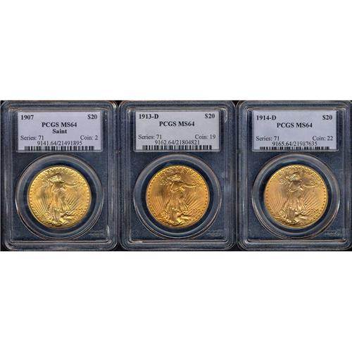Includes: 1907 flat relief Arabic numerals PCGS MS64, 1913-D PCGS MS64, 1914-D PCGS MS64. Lot of 3 coins.