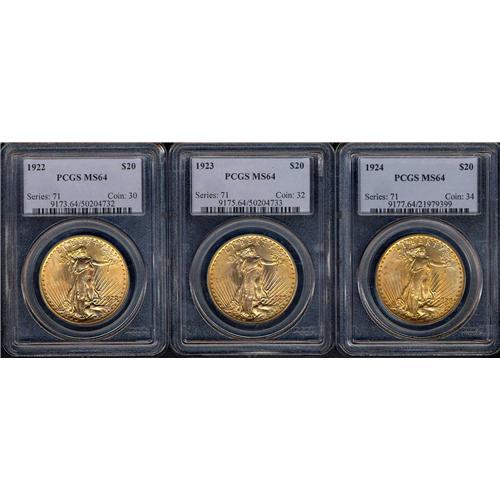 Lot includes: 1-1922 PCGS MS64, 1-1923 PCGS MS64, 1-1924 PCGS MS64. Superb lot of MS64 Saints with clean, frosty surfaces. Lot of 3 coins.