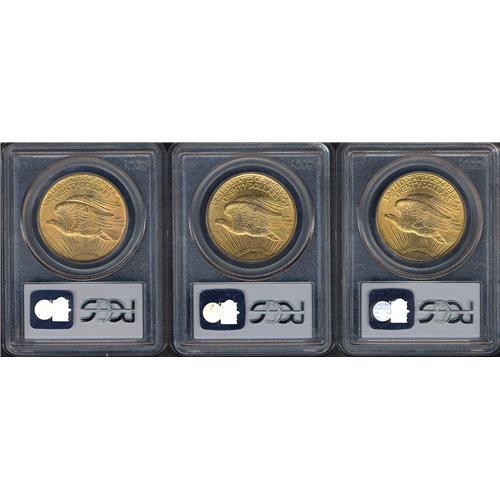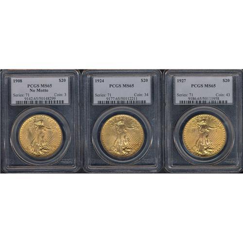 Lot includes: 1-1908 No Motto PCGS MS65, 1-1924 PCGS MS65, 1-1927 PCGS MS65. Very PQ trio of Saint-Gaudens. Two dates are much scarcer in higher grade, which is certainly a possibility. Lot of 3 coins.