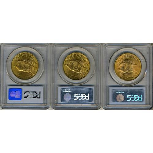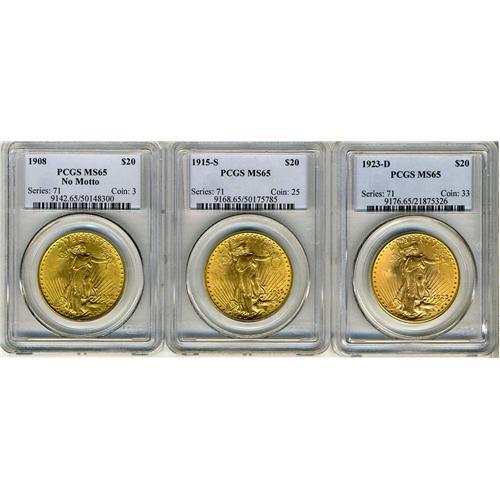 Includes: 1908 No Motto PCGS MS65, 1915-S PCGS MS65, 1923-D PCGS MS65. Lot of 3 coins.