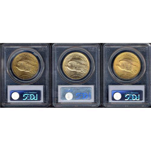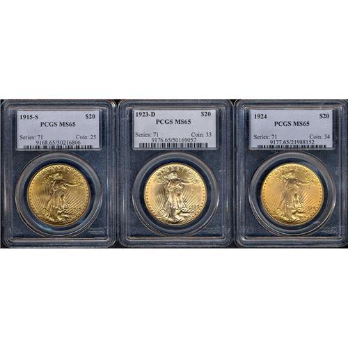 Includes: 1915-S PCGS MS65, 1923-D PCGS MS65, 1924 PCGS MS65. Very PQ group of MS65 Saints. Lot of 3 coins.