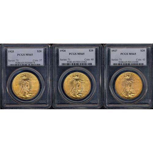 Includes: 1925 PCGS MS65, 1926 PCGS MS65, 1927 PCGS MS65. Lot of 3 coins.