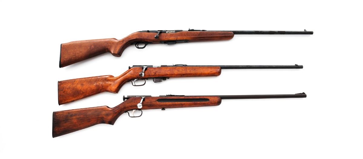 Lot of Three (3) Bolt Action Rifles: (1) Wards-Westernfield Model 35A, NVSN, .22 S-L-LR cal., 24'' barrel, smooth pistol-grip hardwood stock, bright bolt and trigger, ramp blade front sight and notched rear sight with elevator. Condition is good with scattered general surface rust. Metal surfaces retain approx. 70% blue that has toned to an overall dark patina. Stock with little varnish remaining. Action is crisp, bore is very good. (C&R) (2) Wards-Westernfield Model 46A, NVSN, .22 S-L-LR cal., 24'' barrel, blue finish, pistol-grip walnut stock, blade front sight and notched rear sight, bright bolt and trigger, with one magazine. Condition is good retaining approx. 80% thinning and toning blue, with scattered general surface rust. Stock with light to moderate scuffs and scratches. Bolt handle and trigger with flaking and darkening to nickel finish. Action is crisp, bore is good with ring approx. 6'' from muzzle. (C&R) (3) Mossberg Model 740T, #1253199, .22 mag. cal., 24'' barrel, blue finish, pistol-grip walnut stock, brass bead front sight and notched rear sight, checkered black plastic buttplate, with one magazine. Condition is fair. Metal surfaces show patches of moderate to heavy corrosion. Stock shows a medium amount of thinning to the finish, as well as light scuffs and scratches. Action is crisp, bore is fine. Est.: $150-$300/lot. (Modern)