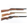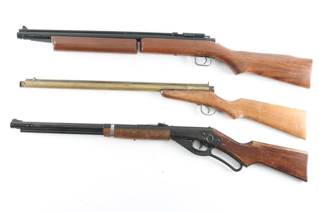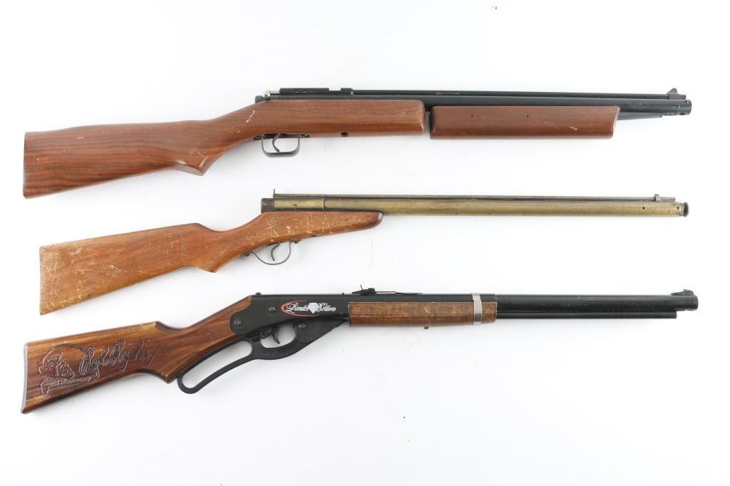 1) Benjamin Sheridan .177 4.5mm pellet rifle in poor/fair condition. Barrel assembly is separated from the air reservoir cylinder. Pump powered, for pellets only. 2) Older brass single pump air gun, 177, needs repair 3) Daisy Red Ryder Limited Edition BB Gun, in good condition
