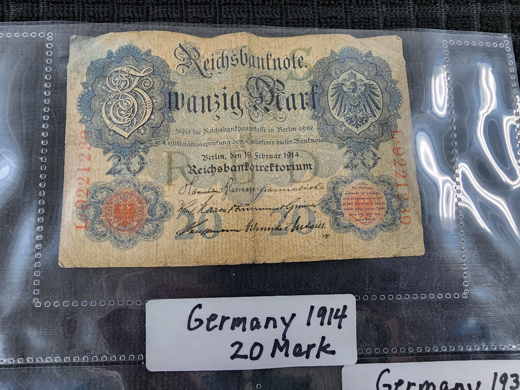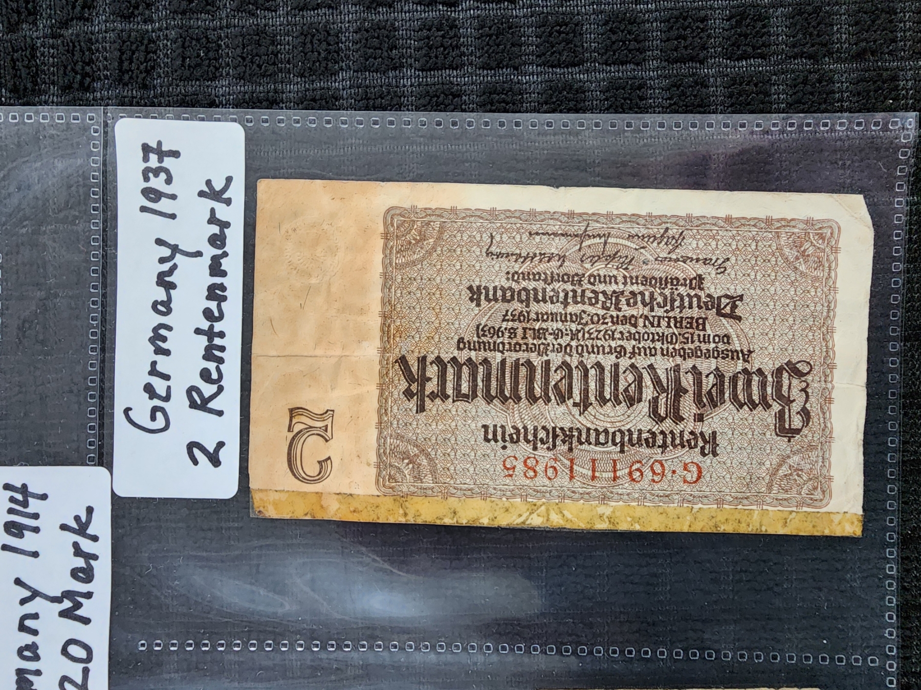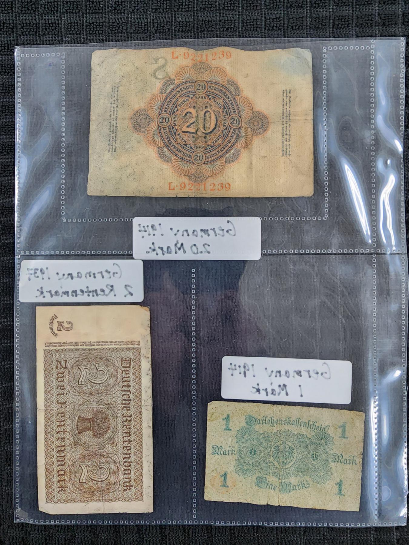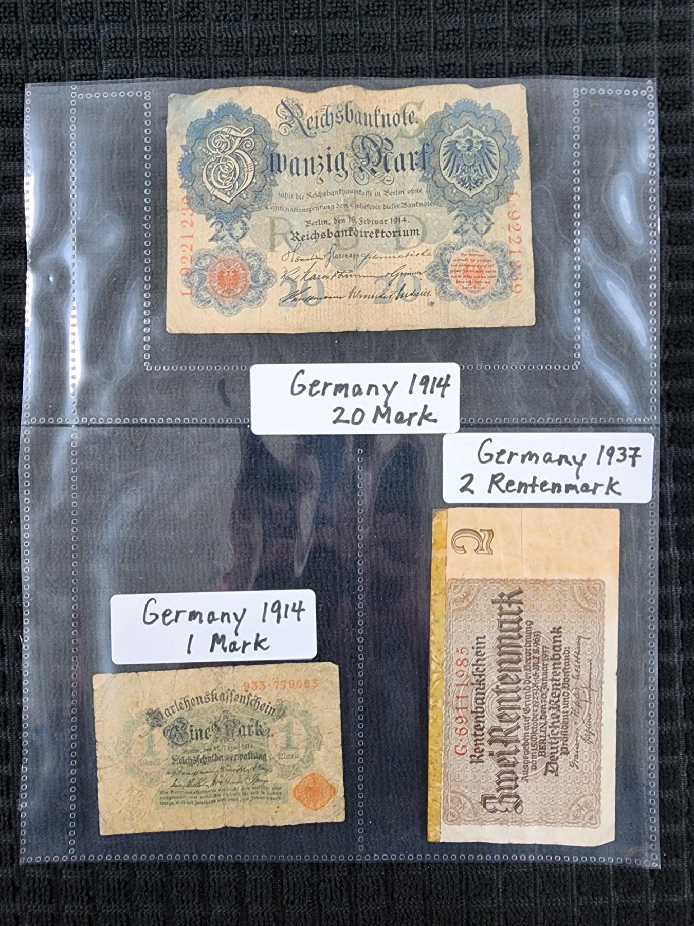 Lot of Three Assorted German Paper Currency Notes Dating Back to 1914 - 1 & 20 Mark With 2 Rentenmark