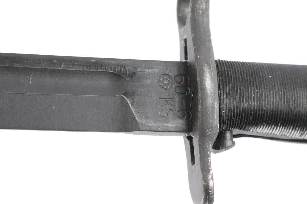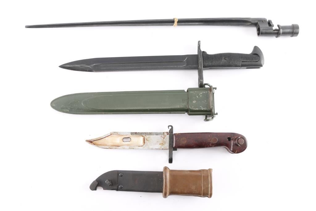 1) Russian Izhevsk Arsenal AKM Type I Bayonet, upgraded AK-47 bayonet, bakelite grips, wire cutter scabbard. Some dried cosmoline on the blade. 2) South Korean M1 Original Korean Army version of the 1943 / 1905 10" blade. Ricasso marked "06-6, KS" with pinwheel symbol. These were imported from the military by Arlington Ordnance years ago. Complete with correct original Korean short scabbard. very Good condition. 3) Russian Mosin-Nagant 91/30 spike bayonet, serial number highlighted in red. Very good condition. Comes with 91/30 rifle cleaning rod.