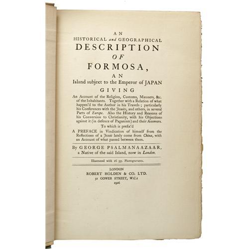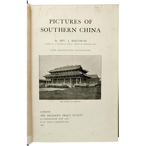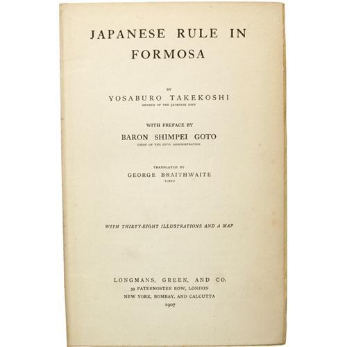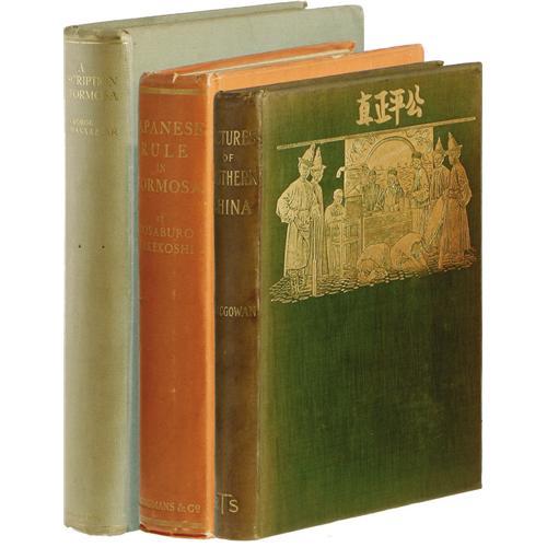 <B>Lot of Three Books on South China and Formosa</B></I> including:<BR><B>Rev. J. Macgowan<I> Pictures of Southern China.</B></I></B></I> (London: The Religious Tract Society, 1897), first edition, 320 pages, photographic illustrations, in original green pictorial boards with gilt titles and decoration, 8vo (6" x 8.75"), former owner's book plate on inside front cover, some foxing to internal pages, sun fading to spine, internal contents sound and tight, very good condition.<BR><B>Yosaburo Takekoshi<I> Japanese Rule in Formosa.</B></I></B></I> (London: Longmans, Green, and Company, 1907), first edition, 342 pages, illustrated, fold-out map, original orange cloth boards with gilt titles, 8vo (6" x 9"), former owner's book plate on the inside front cover, corners bumped, covers soiled, moderate age toning to pages, internal contents sound and tight, very good.<BR><B>George Psalmanaazaar<I> An Historical and Geographical Description of Formosa, An Island Subject to the Emperor of Japan, etc.</B></I></B></I> (London: Robert Holden & Co., Ltd., 1926), limited to 750 copies of which this copy is numbered 177, 288 pages, 16 pages of photogravures, light blue cloth boards with gilt titles, deckled pages, 4to (6.75" x 10"), former owner's book plate on the ffep, major sunning to spine and boards, bumped corners, else very good condition.<BR><BR><b>Shipping:</b> Books & Catalogs (<a target="_blank" href="http://www.heritageauctions.com/common/shipping.php">view shipping information</a>)