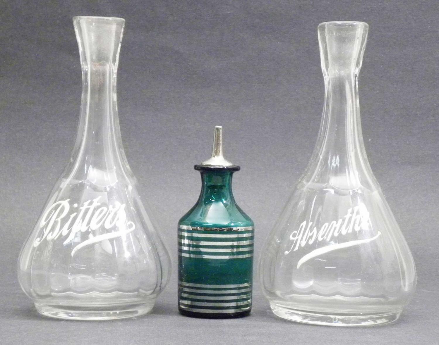 Lot of Three Bottles including jade green barber bottle and two enameled bottles, Bitters/Absenthe. Bitters bottle has tiny chip in the lip otherwise very good condition. Enameled bottles measure 7 1/2 inches tall.