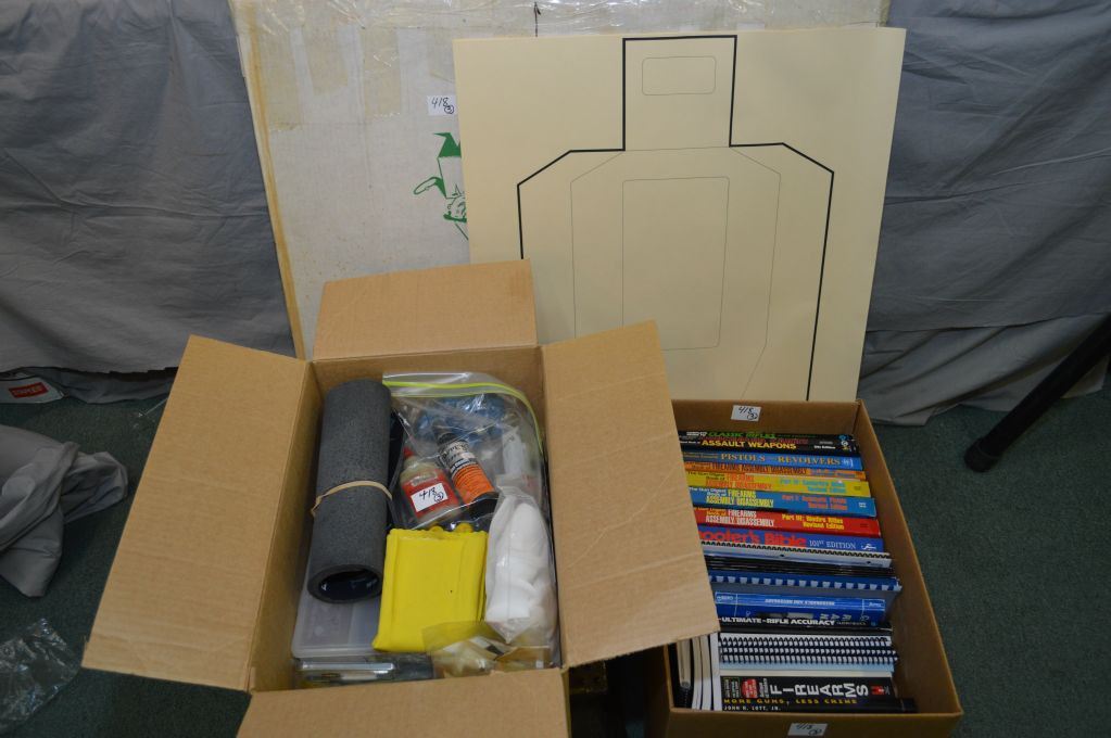 Lot of Three Boxes : Box w/ bundle of targets - Gun cleaning supplies - asstd gun books includ : Guns, Firearms, Shooter's Bibles, Firearms Assembly, M-1, 2, 3 , etc.
