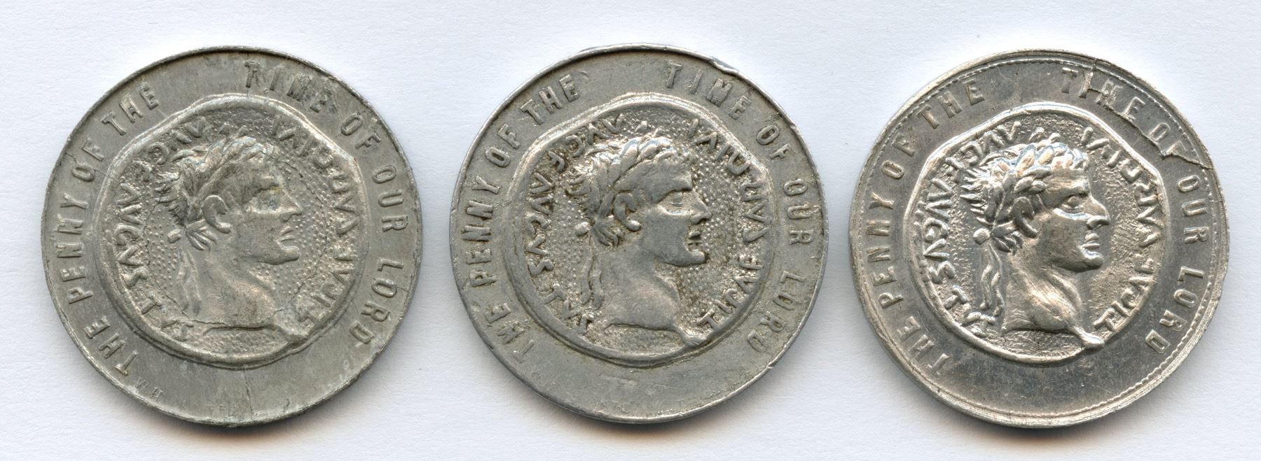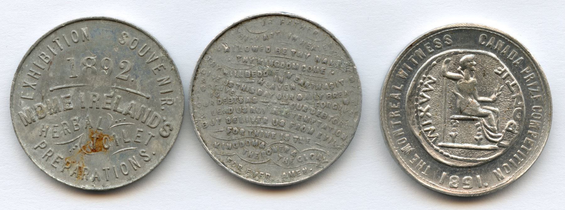 The Montreal Witness Canada Prize Competition, 1891. WM, Unc. Br 609b, Montreal Witness wqith the Lord's prayer, Al, VF. Third example is combined with the reverse of the Mdme. Ireland's Card advertising her herbal toilet preparations at the 1892 Exhibition. Bowman 2894a. Al. EF. 3 pcs.