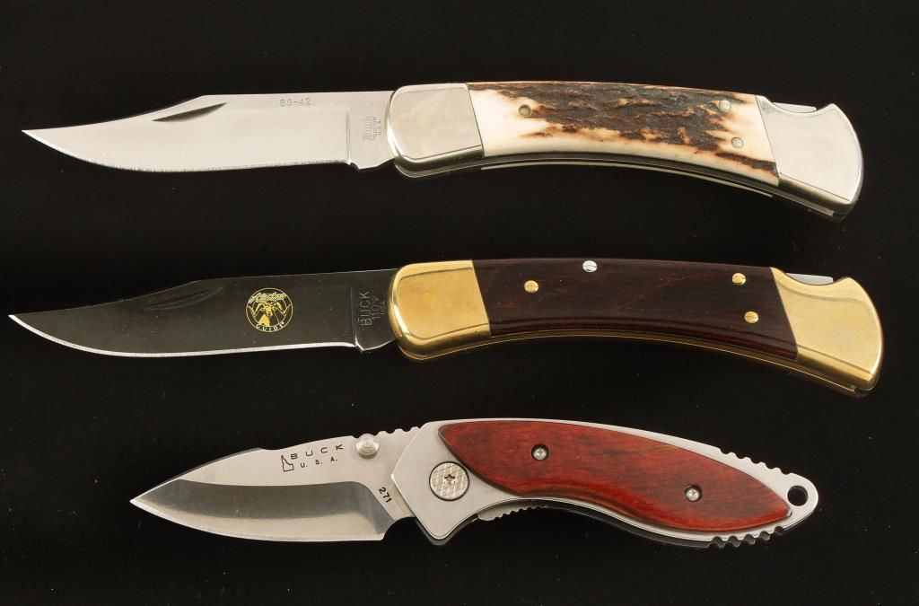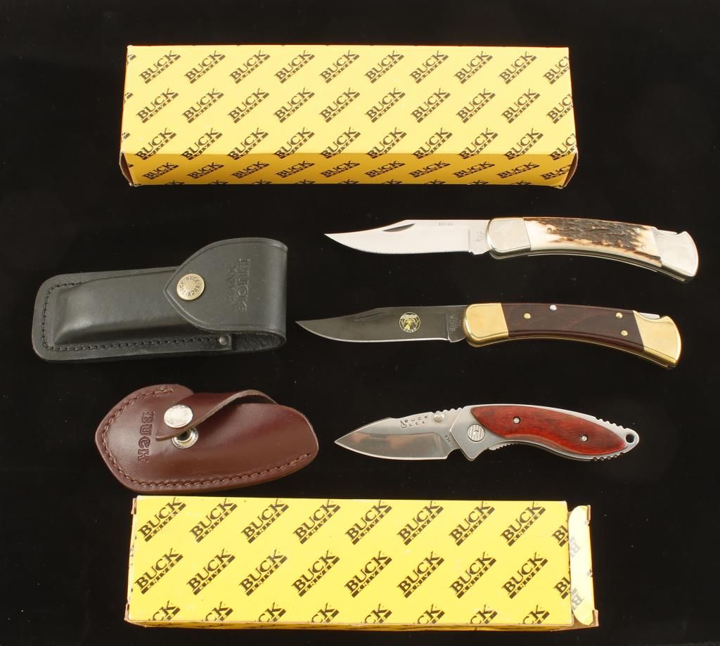 One BG-42 in box with belt pouch. One Alaskan Guide in box with belt pouch. One Buck 271 in box with belt pouch.