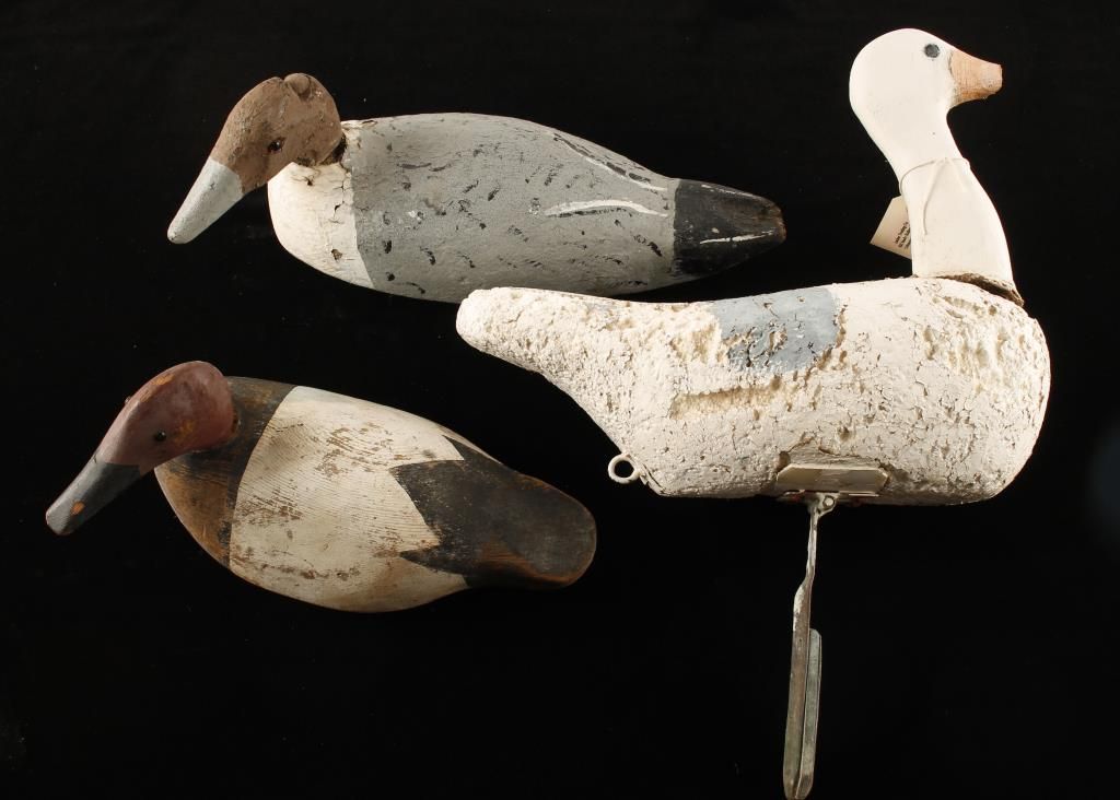 One is a Snow Goose (carved head with Styrofoam body), one looks like a canvas back and the last is possibly a pintail. These were displayed in a restaurant on Oahu, Hawaii.