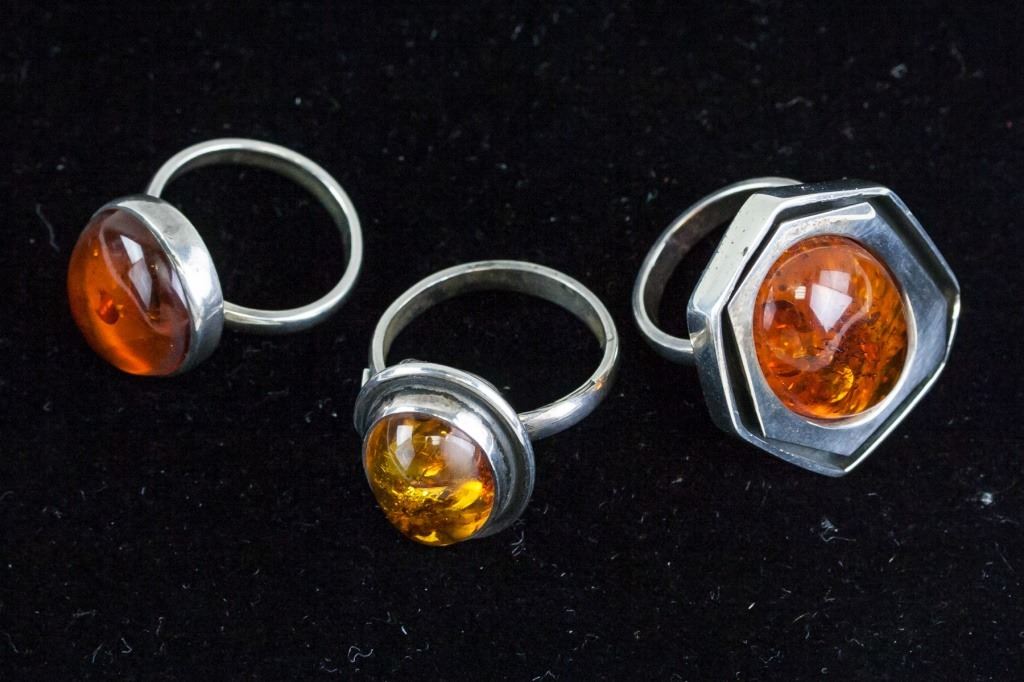 Lot of three (3) rings set with amber. Of orange and yellow tone. On sterling silver. Ring size: 7.5, 7.75, 9.5. 22 g (total).