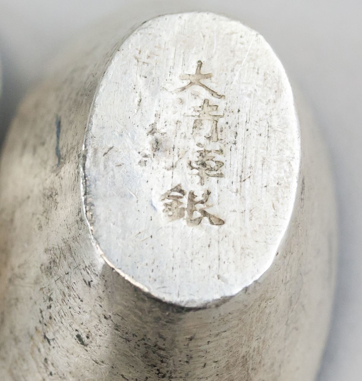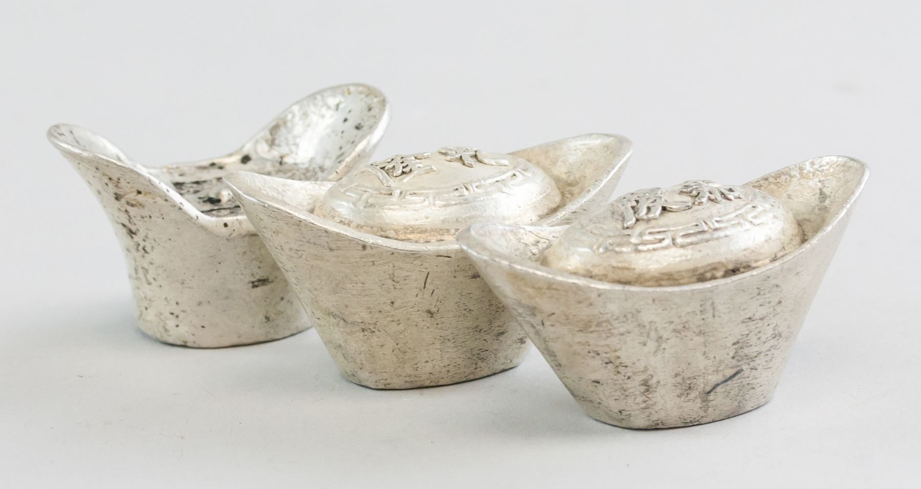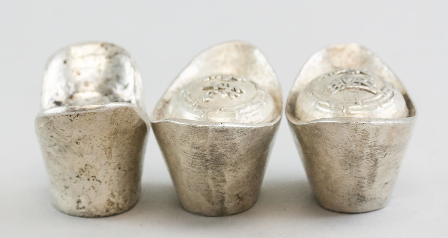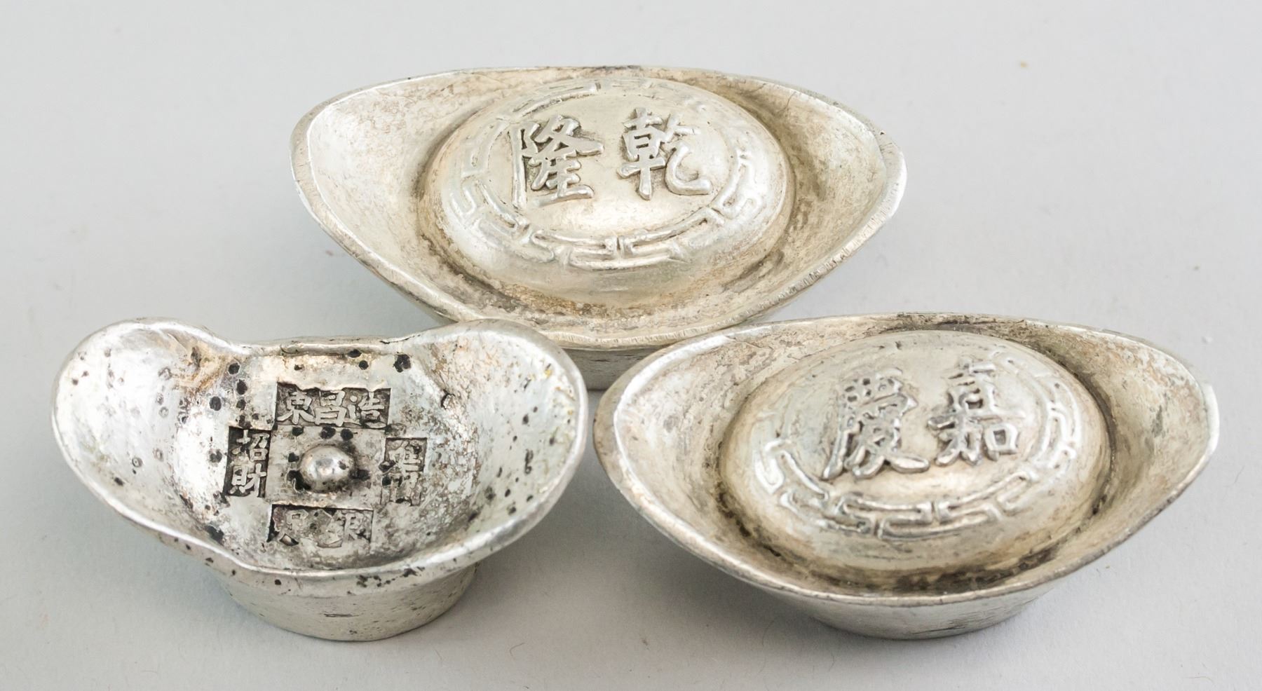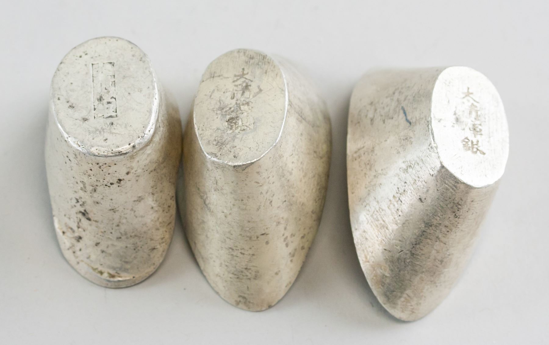Lot of three (3) Chinese silver colored ingots. Stamped with "Qianglong", "Jiaqing", and "Dong Chang Zhao" on face. Stamped with "Da Qing Ku Yin" on base. 3 x 6 cm, 407 grams total