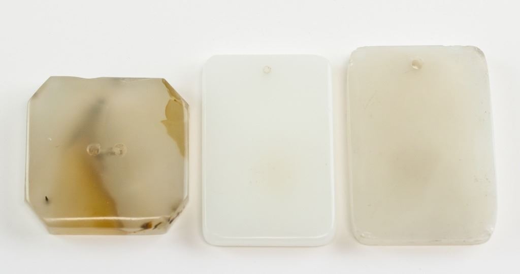 Lot of three (3) Chinese agate pendants. Of rectangular and square shape. Pierced for suspension. 5.5 x 4 cm, 110 grams total.