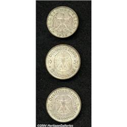 <B>Lot of Three Coins,</B></I> KM44 One Reichsmark 1926-A XF, KM81 2 Reichsmark 1934-A AU and 1934-D BU. 3 coins <BR><BR><B>Important notice:</B> Heritage usually auctions material at the rate of 200-250 lots per hour. On some occasions eBay Live bid software or the Internet may not be able to keep up with the pace of the auction. We recommend placing a realistic absentee bid now as insurance to avoid disappointment. Occasionally the auctioneer may eliminate or reject an eBay Live bid, and the auctioneer may also reopen a lot after the close of the eBay live bidding (usually because we missed an audience bid), and may reject your bid even if it shows you as the winning bidder. By bidding via eBay Live, you agree that Heritage may award the lot to another bidder at its sole discretion under the circumstances described above or any other reasonable circumstances. Since eBay bids are not shown to us until we open the lot on the floor, we treat those bids just like floor bids. In most cases the floor responds before the eBay bid is presented to us, due to Internet lag time, so for consistency we have made it a policy that floor bids are always considered first over tie eBay live bids. Also please note that all Heritage lots purchased through eBay Live carry a 20% Buyer's Premium. Please make sure you read the Terms and Conditions before you bid.