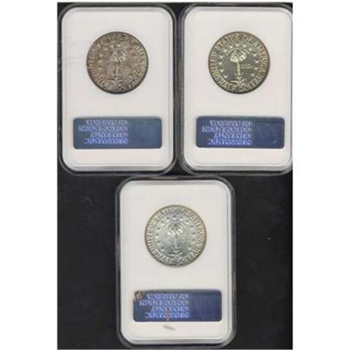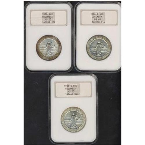 <b>Lot of Three Commemorative Half Dollars.</b> A nice set of the 1936-P,D,S Columbia, South Carolina halves which also include tab toning. All are NGC graded MS65. Lot of 3 coins.