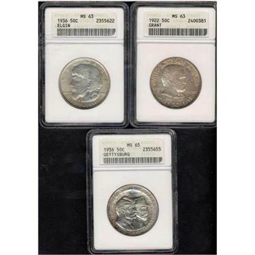 <b>Lot of Three Commemorative Half Dollars.</b> Includes: 1936 ANACS MS63 Elgin, 1922 ANACS MS63 Grant, and 1936 ANACS MS65 Gettysburg. Lot of 3 coins.