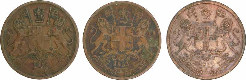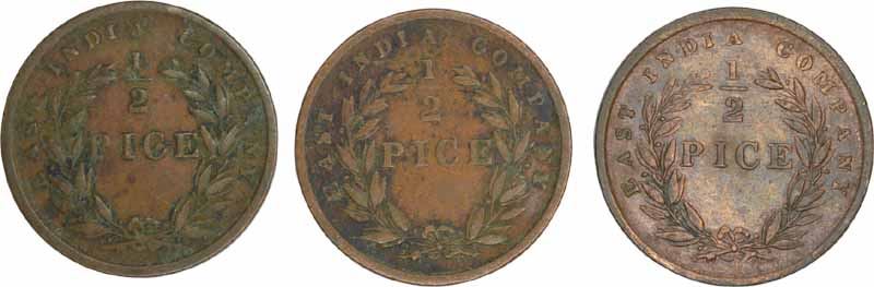 Lot of 3 Coins :1853, East India Company, Copper 1/2 Pice, Calcutta Mint, 19 berries (10L + 9R), (PR # 159), about very fine to extremely fine.