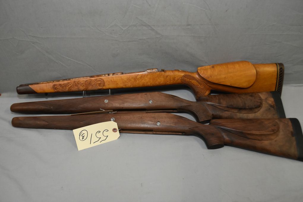 Lot of Three Custom Built Right Hand Deluxe Wood Checkered Pistol Grip Stocks w/ raised cheek piece [ one has darker caps with two Limb Saver & one Rifle Ranch, Riverhurst, Sask recoil pads ]