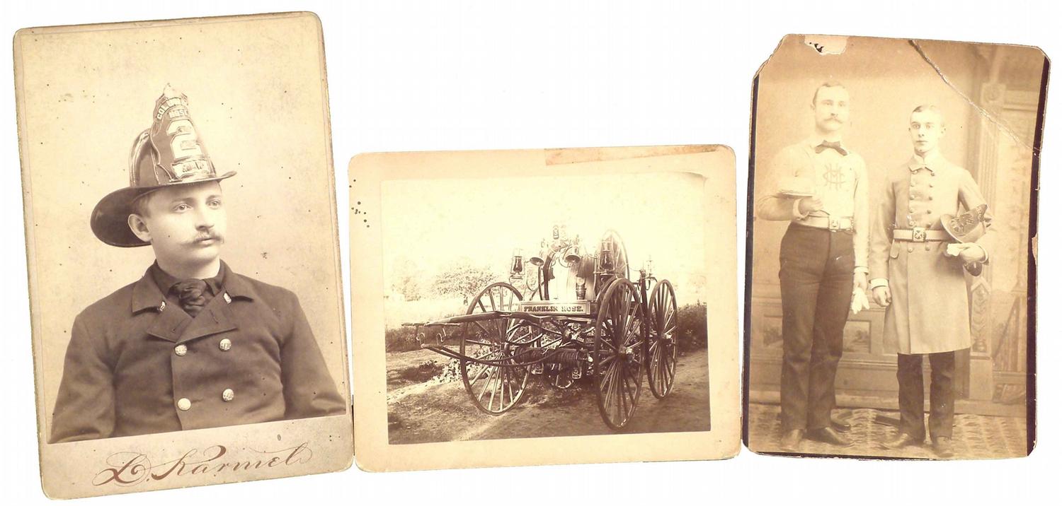 Lot of Three Early Photographs. Jake Wettlaufer, Columbia Hose #2 from the L. Karmel Photo Studio Newburgh, NY. Two Firemen in dress uniforms from the W.L. Sutton Photo Studio Hornellsvill, NY. Franklin Hose Cart Aug. 25, 1888, Orange, NJ. Good to excellent condition. Approx. 4 X 6 inches.