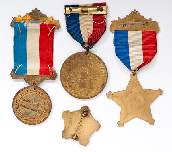 includes a New Mexico Territorial Fair brass medal and red, white and blue silk ribbon, dated September 27-October 1st, 1898, depicting a mounted "New Mexico Rough Rider." 1st U.S. Vol. Cav. brass medal with red, white and blue silk ribbon for 1st annual reunion, Las Vegas, New Mexico. Bust of Col. Theodore Roosevelt on planchet. Souvenir medal with red, white and blue silk ribbon for 1st Annual Reunion, Las Vegas, N.M. Yellow enameled Cavalry Division 5th Corps badge with pinback intact.